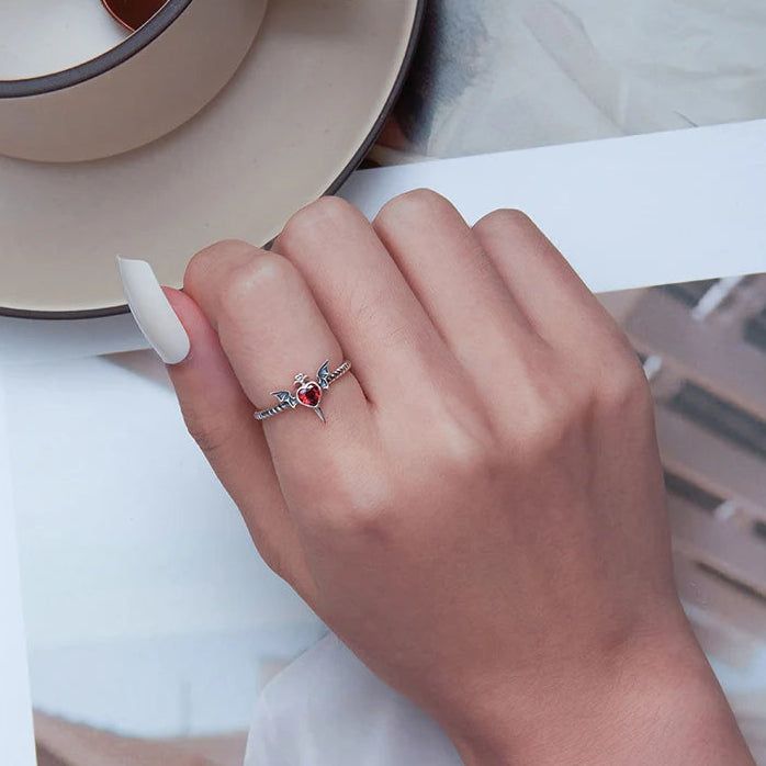 This gothic ring features dramatic bat wings paired with a braided band and a heart shaped cubic zirconia centerpiece in a deep red tone. The design is inspired by gothic, punk, and alternative styles. It features a winged shape and twisted silver. This creates a look that is dark yet elegant. The red heart stone stands for a black heart style often linked to gothic culture. It symbolizes intensity, mystery, and deep emotions.